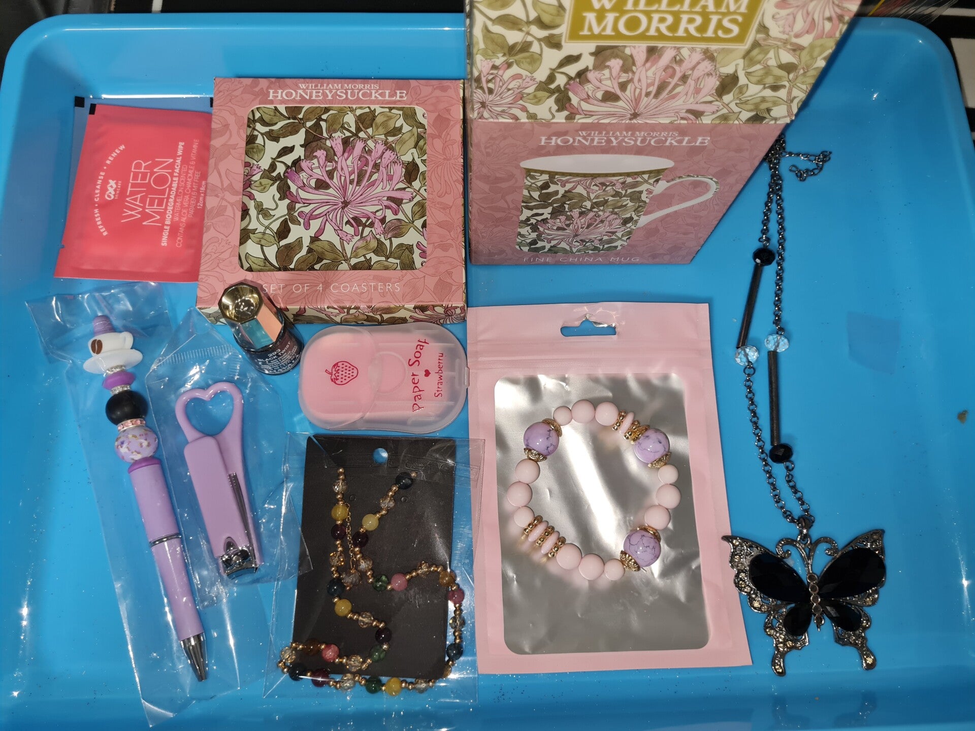 Our hampers consist of multiple different stationery items, household items, arts and craft, manicure items, jewellery, personalised items, hair and grooming items, cosmetics, toiletries and bathroom items.
